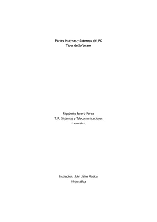 El documento describe las partes internas y externas de un computador, incluyendo componentes como la CPU, tarjeta madre, memoria RAM, discos duros, y periféricos como teclado, mouse y monitor. También explica diferentes tipos de software, como software de programación, tiempo real, gestión, científico, empotrado, para computadoras personales y basado en la web.
