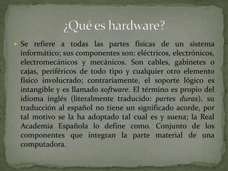 El documento define hardware y software, y los principales tipos de software. El hardware se refiere a las partes físicas de un sistema informático, mientras que el software se refiere a los componentes lógicos. Los tres tipos principales de software son: 1) software de desarrollo, que permite programar aplicaciones; 2) software de sistema, que gestiona los recursos y proporciona una interfaz de usuario; y 3) software de aplicación, que permite realizar tareas específicas como procesar texto o realizar cálculos.
