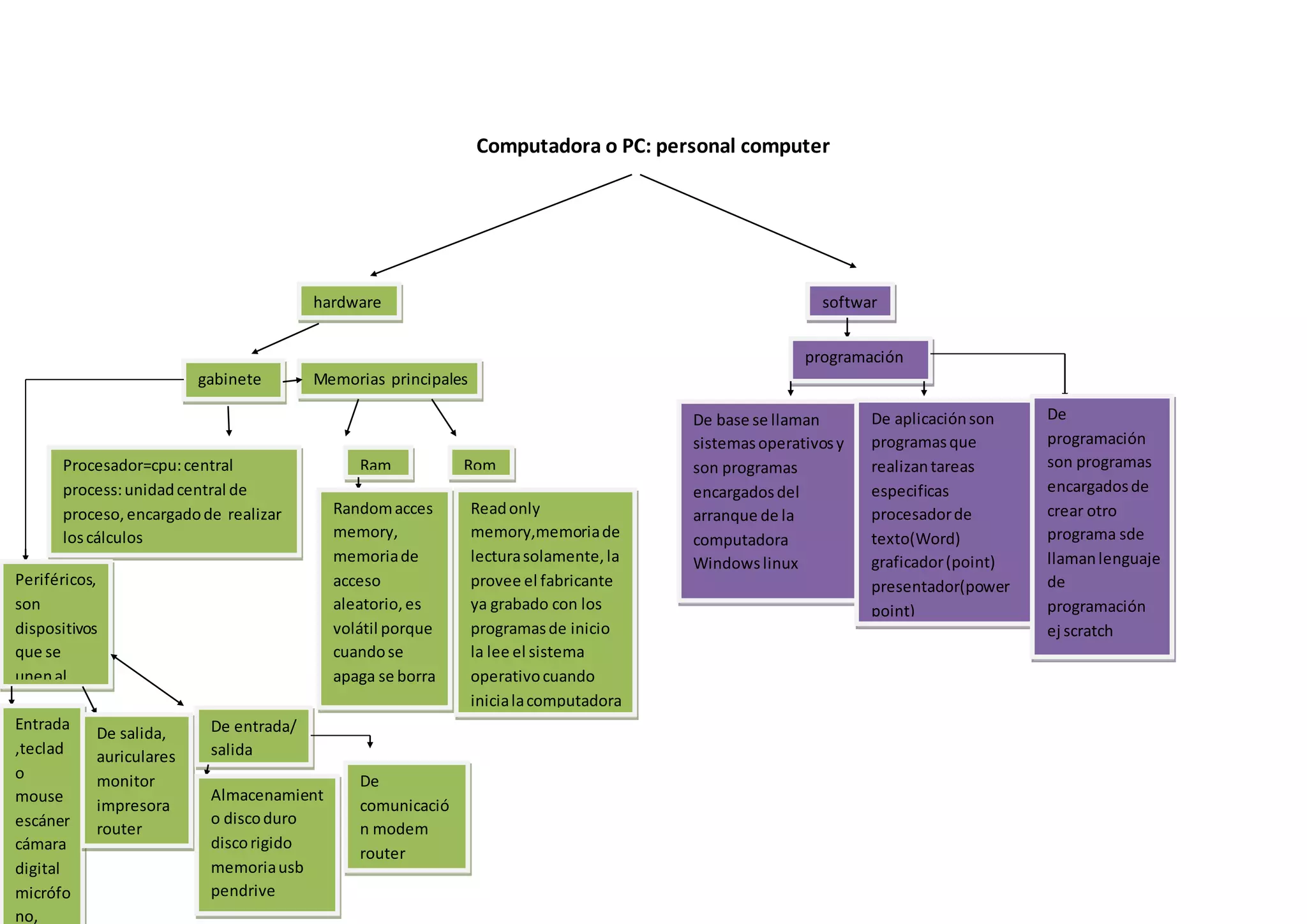 La computadora está compuesta de hardware y software. El hardware incluye el procesador (CPU), la memoria RAM volátil, la memoria ROM permanente provista por el fabricante, y periféricos de entrada como el teclado y mouse, de salida como el monitor e impresora, y de entrada/salida como el disco duro. El software incluye sistemas operativos como Windows y Linux que arrancan la computadora, programas de aplicación como procesadores de texto y presentaciones, y lenguajes de programación para crear otros programas.