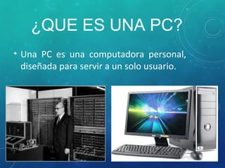 El documento describe los componentes fundamentales de una computadora personal. Explica que una PC está compuesta por hardware y software. El hardware incluye componentes físicos como la CPU, memoria, periféricos de entrada/salida y almacenamiento. El software incluye sistemas operativos, programas de aplicación y programación. Ambos, hardware y software, son indispensables para el funcionamiento de una computadora.