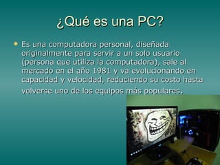 El documento explica los componentes básicos de una computadora personal (PC), incluyendo el hardware y el software. El hardware se compone de la unidad central de procesamiento (CPU), la memoria, y los periféricos como el monitor, teclado e impresora. El software incluye los sistemas operativos como Windows, que permiten la interacción entre el usuario y la máquina, así como programas de aplicación específicos como Word y Excel. Juntos, el hardware y el software son indispensables para el funcionamiento de cualquier computadora.