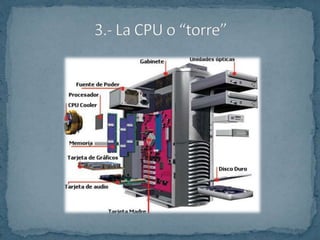 Este documento describe los componentes principales de un ordenador personal, incluyendo el hardware y software. Explica que el hardware son los componentes físicos como la CPU, que contiene la placa base con el microprocesador, memoria RAM, BIOS y ranuras de expansión. También cubre periféricos de entrada/salida y unidades de almacenamiento interno y externo. El software son las instrucciones para hacer funcionar el ordenador, como sistemas operativos y aplicaciones.