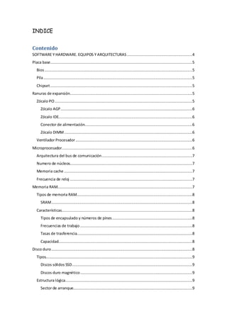 El documento describe los principales componentes de hardware de una computadora, incluyendo la placa base, el microprocesador, la memoria RAM, el disco duro y los periféricos. Explica las funciones de estos componentes y cómo se comunican entre sí para permitir que funcione la computadora.