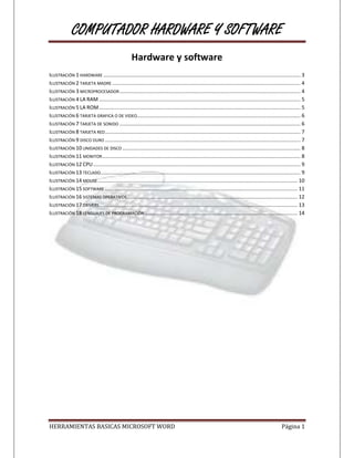 El documento describe los componentes principales del hardware y software de una computadora. Explica que el hardware incluye partes internas como la tarjeta madre, microprocesador, RAM, ROM y partes externas como el monitor, teclado y mouse. También describe componentes como la tarjeta gráfica, de sonido y de red. Además, explica que el software incluye sistemas operativos, programas de aplicación, lenguajes de programación y controladores de dispositivos.