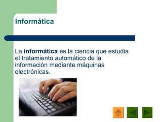 La informática estudia el tratamiento automático de la información mediante máquinas electrónicas, y se divide en áreas como arquitectura de ordenadores, algoritmia, estructuras de datos, lenguajes de programación, ingeniería de software, sistemas operativos, redes y teoría de la computabilidad. El hardware son los elementos físicos que componen el ordenador e incluye hardware básico como la pantalla y el teclado y hardware complementario como la impresora y el escáner. El software son los programas que dirigen las tareas ejecutadas por