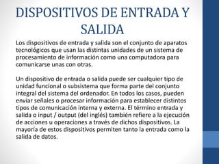 Este documento describe los dispositivos de entrada y salida de una computadora. Incluye teclados, ratones, micrófonos, escáneres, pantallas, impresoras, altavoces y auriculares. También explica que el hardware se refiere a los componentes físicos de una computadora como la motherboard y la memoria RAM, mientras que el software incluye programas como el sistema operativo y aplicaciones. Finalmente, clasifica el software en sistemas y de aplicación.