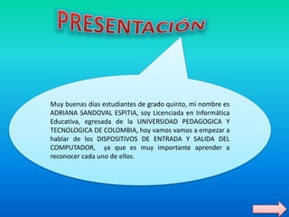 La licenciada Adriana Sandoval presenta una lección sobre los dispositivos de entrada y salida del computador a estudiantes de quinto grado, explicando que son importantes para reconocer cada uno y permiten la comunicación entre el usuario y la computadora, con los dispositivos de entrada introduciendo datos para su procesamiento y los de salida representando los resultados.