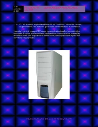 El documento define hardware y software. El hardware se refiere a los componentes físicos de una computadora como la CPU, monitor, mouse, unidad de disquetes. El software se refiere a los programas, datos y documentación que hacen posible las operaciones de una computadora como sistemas operativos, aplicaciones y programas.