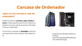 Este documento describe varios componentes clave de una computadora, incluyendo la carcasa, la placa base, el microprocesador, la memoria RAM, la tarjeta gráfica, el disco duro, la unidad de almacenamiento, la tarjeta de sonido, el monitor y los periféricos de entrada como el teclado y el ratón. Explica sus funciones, tipos y evolución a través del tiempo para mejorar el rendimiento general de las computadoras.
