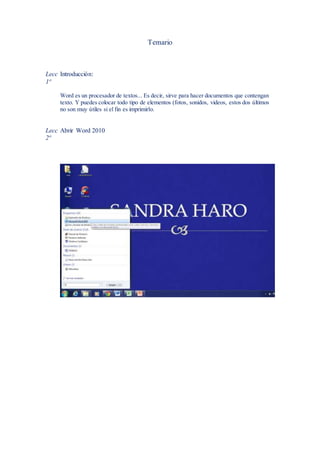 Este documento presenta un plan de estudios para un curso de introducción a Microsoft Word 2010. Consiste en 41 lecciones que cubren temas como abrir y guardar archivos, la interfaz de usuario, formato de texto, tablas, imágenes, gráficos e inserción de contenido multimedia. El objetivo general es enseñar a los estudiantes cómo usar las funciones y herramientas básicas de Word para crear y editar documentos.