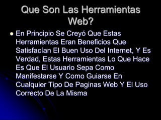 Este documento presenta las diferentes generaciones de la web: Web 1.0, que consistía en documentos HTML conectados por hipervínculos; Web 2.0, que facilita compartir y colaborar a través de blogs, wikis y otras herramientas; y Web 3.0, que podría incluir espacios 3D y aplicaciones con inteligencia artificial y razonamiento semántico.