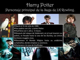 Este documento presenta a los personajes más memorables del mundo mágico de J.K. Rowling, incluyendo al protagonista Harry Potter, sus amigos Hermione Granger y Ron Weasley, el poderoso mago Albus Dumbledore, el profesor Severus Snape, el enemigo de Harry Draco Malfoy y el mayor mago tenebroso Lord Voldemort.