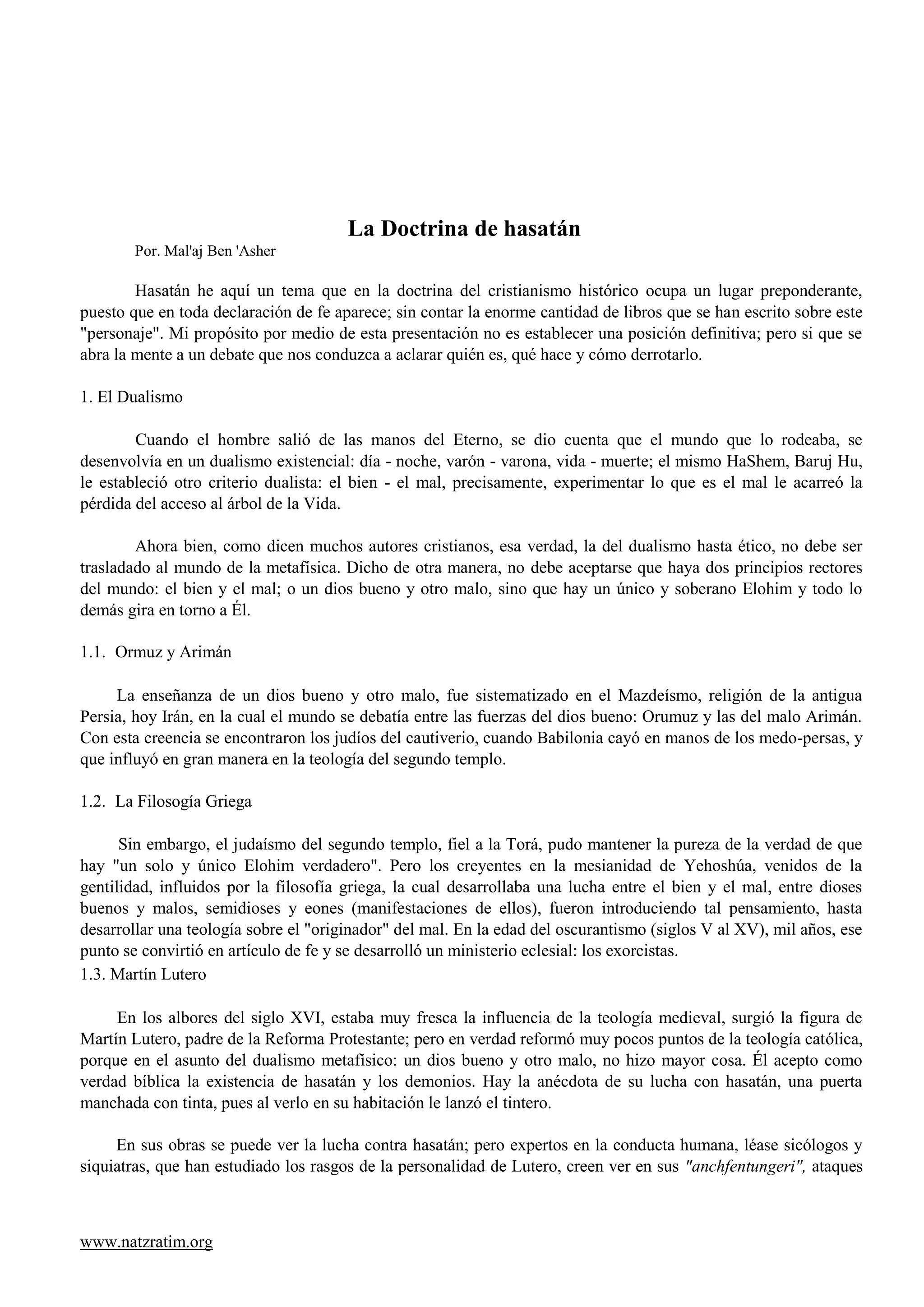 Este documento resume la doctrina cristiana tradicional sobre Satanás y argumenta que no está bien fundamentada bíblicamente. Explica que la noción de un principio del mal dualista no se encuentra en el Antiguo Testamento hebreo y más bien surgió de influencias helénicas y del mazdeísmo persa. También analiza pasajes bíblicos comúnmente citados para referirse a la caída de Satanás, concluyendo que en realidad se refieren a reyes y líderes humanos, no a un ser espiritual. El documento