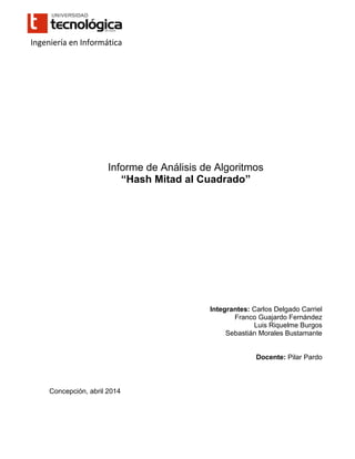 Este informe analiza diferentes algoritmos de búsqueda como la búsqueda lineal, búsqueda binaria y varios métodos de hash como el truncamiento, plegamiento, aritmética modular y mitad del cuadrado. Este último método se explica con más detalle mostrando cómo funciona, los factores a considerar y ejemplos para ilustrar el cálculo de las direcciones hash. Finalmente, la conclusión es que no existe un mejor algoritmo sino que depende del problema a resolver.