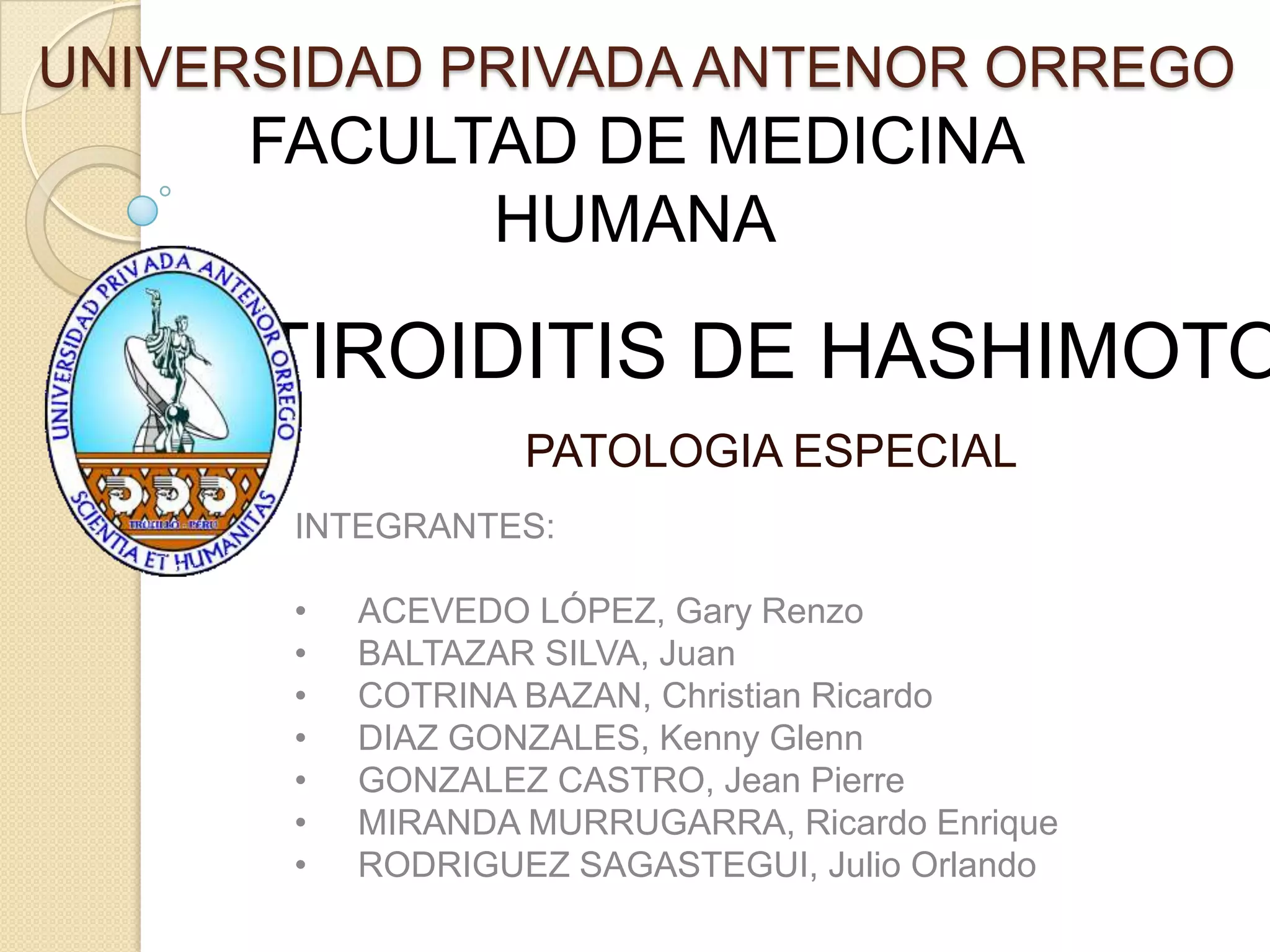 Este documento presenta el caso de una paciente de 31 años que desarrolló tiroiditis de Hashimoto después del parto. Presentó síntomas de hipotiroidismo como sudoración, calor, palpitaciones e insomnio tres meses después de dar a luz. Las pruebas de laboratorio mostraron niveles bajos de T3 y T4 y alto de TSH, así como la presencia de anticuerpos antitiroideos. La biopsia de tiroides confirmó el diagnóstico de tiroiditis de Hashimoto por la presencia de infiltración l