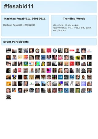 Este documento contiene tweets relacionados con el hashtag #fesabid11 del día 25 de mayo de 2011. Los tweets discuten varios temas como la preservación del patrimonio digital, el proceso de certificación de sistemas de gestión, el futuro profesional de los auditores y el uso de redes sociales para difundir el trabajo de bibliotecas y museos. Los asistentes comparten enlaces e información sobre proyectos de archivos web y preservación digital presentados en la conferencia.