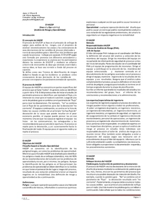 El documento describe el proceso HAZOP (análisis de riesgos y operabilidad), que utiliza un enfoque de equipo para identificar sistemáticamente desviaciones en las variables de proceso y sus consecuencias. Se enfatiza en la importancia de la colaboración entre expertos de diferentes disciplinas para proporcionar un análisis exhaustivo de los riesgos, así como en la identificación de problemas operativos que pueden generar riesgos. Finalmente, se discuten las medidas de control y recomendaciones para mitigar los riesgos identificados durante el análisis.