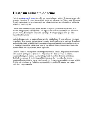 El aumento de senos es una cirugía que puede mejorar el volumen y la apariencia del busto, lo que a menudo incrementa la confianza personal. Los mejores candidatos son aquellas mujeres que buscan una mejoría en su apariencia, con una recomendación de no realizar la operación antes de los 18 años. La intervención se lleva a cabo mediante la inserción de implantes de silicona o suero salino, materiales bien tolerados por el cuerpo.