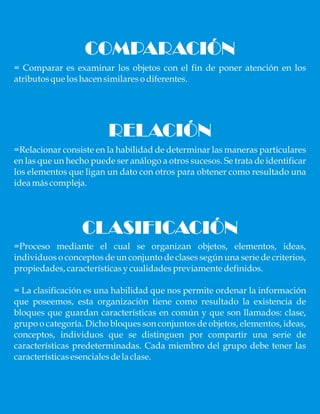El documento describe las habilidades cognitivas básicas de observación, descripción, comparación, relación y clasificación. La observación representa la entrada de información a través de los sentidos y puede ser directa o indirecta. La descripción implica identificar las características de un objeto. Comparar examina los atributos que hacen similares o diferentes los objetos. Relacionar determina cómo un hecho se relaciona con otros. La clasificación organiza elementos en clases según criterios definidos.