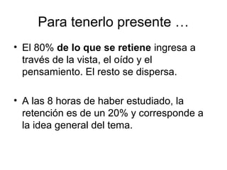 El documento habla sobre hábitos y técnicas de estudio efectivas. Explica que el aprendizaje es un proceso cíclico que implica percibir, representar y conceptualizar información. También discute que aprendemos a través de la imitación, repetición, ensayo y error, actitud positiva y concentración. Además, define hábitos de estudio como repetir el acto de estudiar bajo las mismas condiciones y técnicas de estudio como estrategias para hacer el trabajo de manera rápida y eficaz.