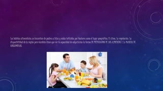 Los hábitos alimenticios se transmiten de generación en generación y están influenciados por factores ambientales y socioeconómicos. La falta de una alimentación balanceada puede ocasionar problemas de salud graves como anemia, diabetes y obesidad. Una encuesta a estudiantes mostró que la mayoría no consume suficientes frutas y verduras y realiza poco ejercicio físico, lo que los expone a una mala alimentación y enfermedades.