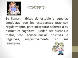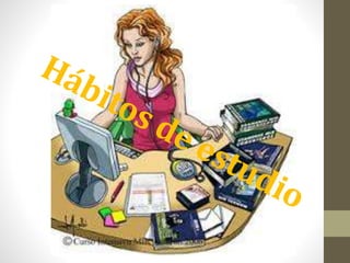 El documento describe hábitos de estudio efectivos que los estudiantes pueden adoptar, como planificar horarios específicos para el estudio, estudiar a horas fijas cada día, establecer metas claras para cada sesión de estudio, comenzar con las asignaciones más difíciles, repasar notas antes de empezar tareas, pedir ayuda a otros cuando sea necesario, y repasar el trabajo el fin de semana.
