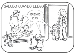 Este documento presenta una lista de reglas y expectativas de comportamiento para estudiantes en el aula y durante el día escolar. Incluye instrucciones sobre cómo saludar y despedirse, mantener el orden en el salón de clases, compartir materiales, comportarse en la mesa durante las comidas y en el patio de recreo, y usar el baño de manera apropiada.