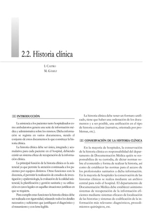 La historia clínica es el conjunto de documentos médicos y administrativos de un paciente. Debe ser única e integrada para cada paciente y tener un formato unificado. La historia clínica está formada por documentos como informes médicos, de enfermería, quirúrgicos y de alta, entre otros. Estos documentos deben archivarse de forma ordenada y confidencial siguiendo las normas del hospital.