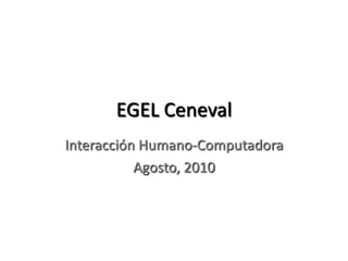 Este documento presenta una descripción de un curso sobre Interacción Humano-Computadora para preparar el examen EGEL Ceneval. Incluye los objetivos del curso, que son nivelar y preparar a los aspirantes en esta área de conocimiento presentando los temas señalados y resolviendo dudas. También lista varios libros de texto y recursos en línea relacionados con el diseño de interfaces humano-computadora.
