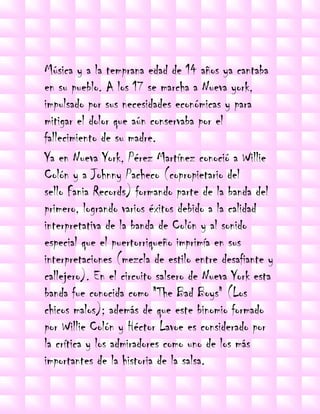 Héctor Lavoe nació en Puerto Rico en 1946 y se mudó a Nueva York a los 17 años para buscar oportunidades económicas. Allí conoció a Willie Colón y formó parte de su banda, logrando éxitos gracias a su estilo interpretativo único. Lavoe y Colón son considerados una de las parejas musicales más importantes en la historia de la salsa. Willie Colón nació en Nueva York en 1950 de ascendencia puertorriqueña y se convirtió en uno de los pioneros del desarrollo del movimiento salsero en los