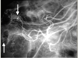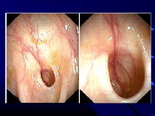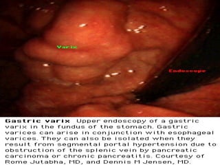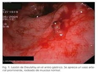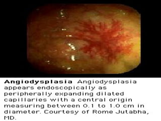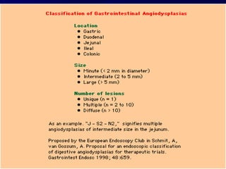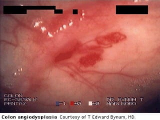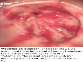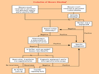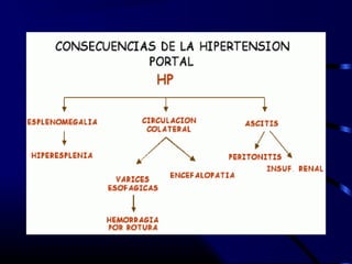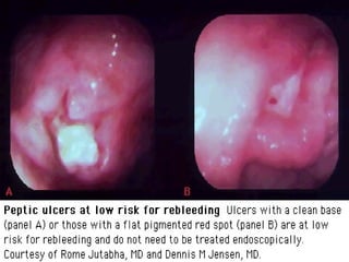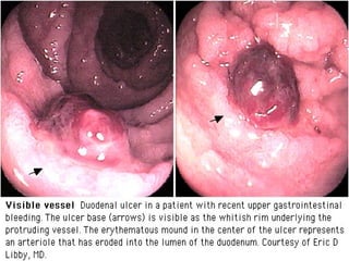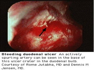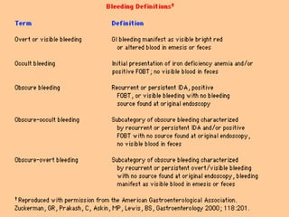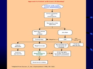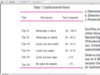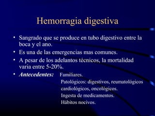 Este documento describe la hemorragia digestiva, incluyendo su definición, síntomas, causas comunes, exámenes auxiliares y tratamiento. La hemorragia digestiva puede ser alta u baja dependiendo de su ubicación en el tracto gastrointestinal. Las causas más frecuentes de sangrado alto incluyen úlcera péptica, varices esofágicas y gastritis, mientras que la diverticulosis, neoplasias y angiodisplasia son causas comunes de sangrado bajo. El manejo involucra estabilización del paciente,