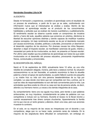 El documento discute el aprendizaje escolar y los problemas de aprendizaje. Explica que el aprendizaje es el resultado de un proceso de enseñanza que involucra conocimientos previos y nueva información. Un bajo rendimiento escolar puede deberse a factores económicos, sociales, políticos o culturales. También describe a una niña de 12 años que tiene dificultades en matemáticas y problemas de comportamiento en el aula.