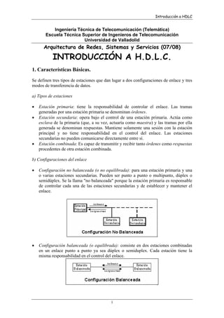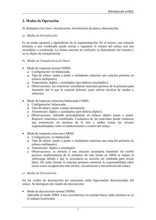 1) HDLC define tres tipos de estaciones (primaria, secundaria, combinada) que dan lugar a dos configuraciones de enlace (no balanceada y balanceada) y tres modos de transferencia de datos (NRM, ABM, ARM). 2) Las tramas HDLC tienen un formato estándar que incluye campos de guión, dirección, control e información. 3) Existen tres tipos de tramas: de información para datos, de supervisión para control de flujo y errores, y no numeradas para funciones especiales.