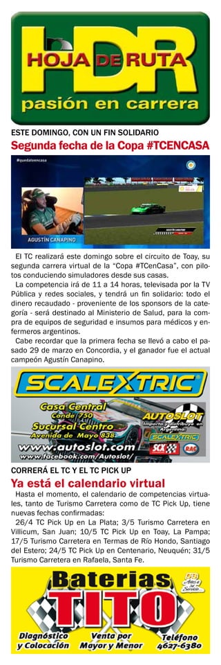 La segunda fecha de la Copa #TCenCasa se llevará a cabo este domingo, donde los pilotos competirán desde sus casas usando simuladores. La recaudación se donará al Ministerio de Salud para la compra de equipos médicos. El calendario virtual de TC y TC Pick Up incluye carreras hasta fines de mayo. Los equipos de Súper TC 2000 también se preparan para cuando se reanude la temporada.