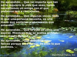 El documento presenta una serie de lecciones aprendidas a lo largo de la vida. Entre ellas, que cuando se está enamorado se nota, que una palabra amable puede alegrar el día de alguien, y que ser niño es más importante que tener razón. También incluye lecciones como que siempre se puede orar por alguien que necesita ayuda, la importancia de reír con los amigos, y que a veces la gente solo necesita una mano que sostener y un corazón que entienda.