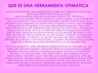 Las herramientas ofimáticas más comunes son las suites de Microsoft Office y OpenOffice, que incluyen programas como Word para procesamiento de textos, Excel para hojas de cálculo, Access para bases de datos, y PowerPoint para presentaciones. Estas herramientas han evolucionado desde la década de 1970 para automatizar y mejorar los procesos de oficina, reemplazando métodos manuales como las máquinas de escribir. Permiten crear, modificar y compartir una variedad de documentos e información.