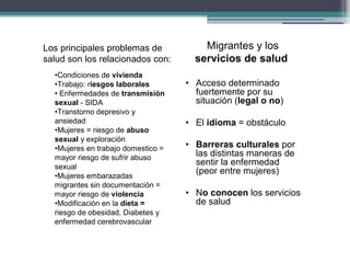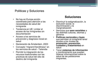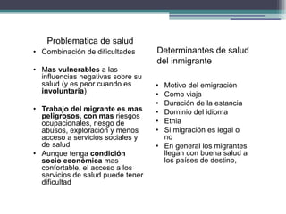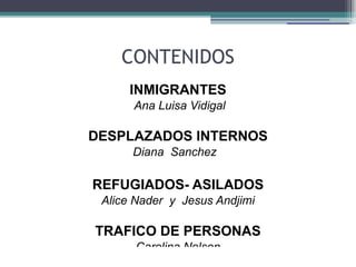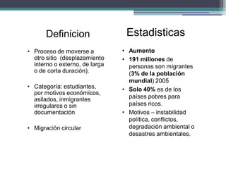 Este documento presenta información sobre diferentes grupos de migrantes y desplazados, incluyendo inmigrantes, desplazados internos, refugiados-asilados y víctimas de tráfico de personas. Describe brevemente las definiciones, estadísticas clave y problemas de salud de cada grupo.