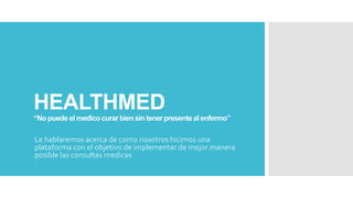 La plataforma Healthmed ofrece consultas médicas seguras y confiables a distancia para mejorar la experiencia del paciente. La plataforma implementa un sistema de citas médicas en línea que permite a los doctores agendar y modificar citas dependiendo de la gravedad del caso del paciente. Las citas a distancia ofrecen ventajas como prevenir enfermedades infecciosas, agilizar las consultas y mejorar el acceso a la atención médica para pacientes con dificultades para asistir a una clínica.