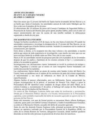 El documento resume el caso de la desaparición de 12 jóvenes del bar Heaven en Tepito, México. Las autoridades carecen de pistas sobre el paradero de los jóvenes a pesar de las investigaciones. La incompetencia y corrupción de la policía, así como la posible participación del crimen organizado, han dificultado el esclarecimiento del caso. Se teme que el caso quede impune debido a la debilidad de las pruebas contra los pocos detenidos.