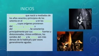 El heavy metal surgió a mediados de los años 1960 como fusión del blues rock, hard rock y rock psicodélico, caracterizado por guitarras distorsionadas, ritmos enfáticos, sonidos densos de bajo y batería, y voces agudas. A finales de esa década y principios de los 1970 surgieron más bandas que contribuyeron al desarrollo del género. El heavy metal se caracteriza por la forma típica de las bandas y el uso prominente de instrumentos como la guitarra eléctrica, batería y bajo. Al