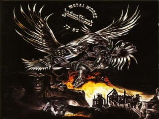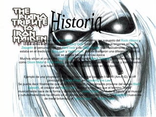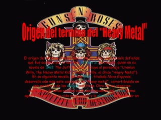 El documento discute el origen del término "heavy metal" y cómo evolucionó el género musical a lo largo de los años 1970. Señala que William S. Burroughs puede haber acuñado el término y que bandas como Black Sabbath, Led Zeppelin y Deep Purple influyeron en el desarrollo del heavy metal a través de su sonido distorsionado y agresivo. También examina los instrumentos y técnicas característicos del género.