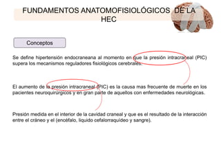 Este documento describe los fundamentos anatómicos y fisiológicos de la hipertensión endocraneana, incluyendo las causas, cuadro clínico, monitoreo y tratamiento. Define la hipertensión endocraneana como cuando la presión intracraneal supera los mecanismos reguladores fisiológicos. Explica que un aumento del volumen de cualquier componente intracraneal como sangre, tejido cerebral o líquido cefalorraquídeo puede causar un aumento de la presión intracraneana. Finalmente,