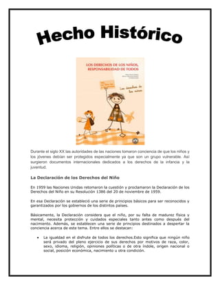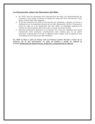 Durante el siglo XX, los países tomaron conciencia de que los niños necesitan protección especial como grupo vulnerable. En 1959, las Naciones Unidas proclamaron la Declaración de los Derechos del Niño para establecer principios como la igualdad de derechos y la protección de los niños antes y después del nacimiento. Luego, en 1990 se adoptó la Convención sobre los Derechos del Niño, que entró en vigor ese mismo año y fue ratificada por Argentina para jerarquizarla constitucionalmente y proteger los derechos de los niños.