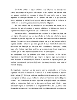 El documento define el hecho imponible como el presupuesto establecido por la ley que origina la obligación tributaria. Explica que el hecho imponible tiene un aspecto subjetivo y objetivo. El subjetivo se refiere a la persona sujeta al gravamen, mientras que el objetivo incluye los aspectos material, espacial y temporal del hecho. También establece que el hecho imponible es un hecho jurídico aunque en sustancia sea económico, y puede consistir en un acto, actividad o conjunto de ellos previstos por la le