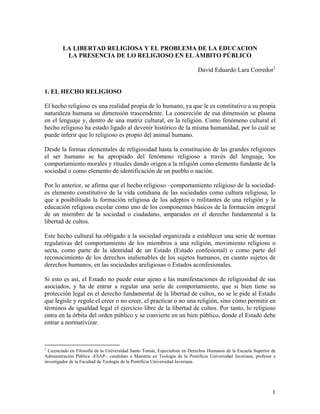 El documento discute la presencia de lo religioso en la educación pública en América Latina. Explica que el hecho religioso ha sido parte integral de las sociedades latinoamericanas y de la formación de sus ciudadanos. Durante la colonia, la educación religiosa se impartía a través de la catequesis y los sacramentos con el objetivo de cristianizar a la población. En la actualidad, la educación religiosa escolar se imparte en la escuela pública de muchos países latinoamericanos, aunque con modalidades diversas y