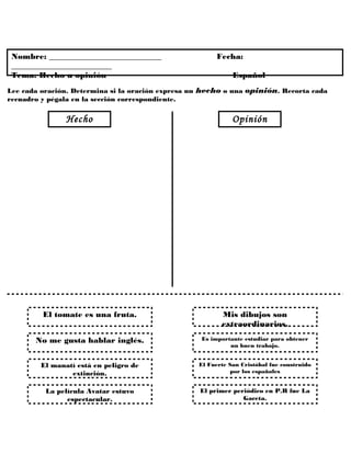 El documento proporciona instrucciones para clasificar oraciones como hechos u opiniones cortando y pegando recuadros en las secciones correspondientes. Se dan algunos ejemplos de oraciones, incluyendo que el tomate es una fruta, el manatí está en peligro de extinción, el Fuerte San Cristóbal fue construido por los españoles, y el primer periódico en Puerto Rico fue La Gaceta.