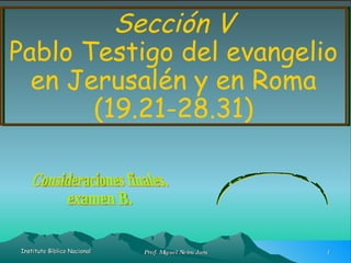El documento resume la sección final del libro de Hechos, que describe las actividades misioneras de Pablo en Jerusalén, Cesarea y Roma. Incluye su arresto, juicios y apelación ante el emperador, así como su naufragio y llegada a Roma, donde continúa predicando el evangelio abiertamente por dos años.
