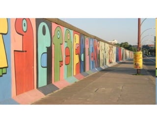 El documento resume la historia y evolución del graffiti. Comenzó como marcas e inscripciones en la antigua Roma y fue practicado por piratas en el pasado. Más tarde, artistas pioneros como Taki 183 y Phase 2 popularizaron el graffiti en el metro de Nueva York en los años 70. Hoy en día, el graffiti es reconocido como un arte urbano que ha florecido en ciudades como São Paulo, Melbourne, Berlín y Santiago de Chile.