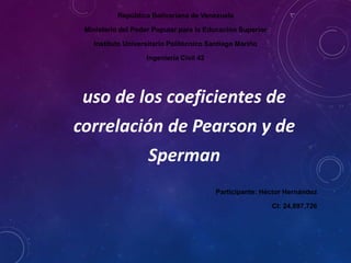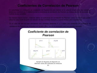 Este documento explica el uso de los coeficientes de correlación de Pearson y Spearman. El coeficiente de Pearson mide la relación lineal entre dos variables cuantitativas, mientras que el coeficiente de Spearman se usa para variables ordinales. Ambos coeficientes varían de -1 a 1, donde valores cercanos a 1 indican una fuerte correlación positiva y valores cercanos a -1 una fuerte correlación negativa. El documento también describe cómo calcular e interpretar estos coeficientes y sus ventajas y desventajas respectivas.