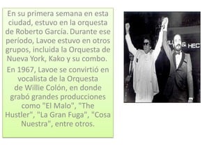 Héctor Lavoe fue un cantante puertorriqueño de salsa nacido en 1946 que se mudó a Nueva York a los 16 años. Se convirtió en el vocalista de la orquesta de Willie Colón en 1967, donde grabó éxitos como "El Malo" y "La Gran Fuga". Lavoe cayó en la adicción a las drogas y sufrió depresión tras la muerte de su hijo en 1987. Murió en 1993 de complicaciones por el SIDA a los 46 años.